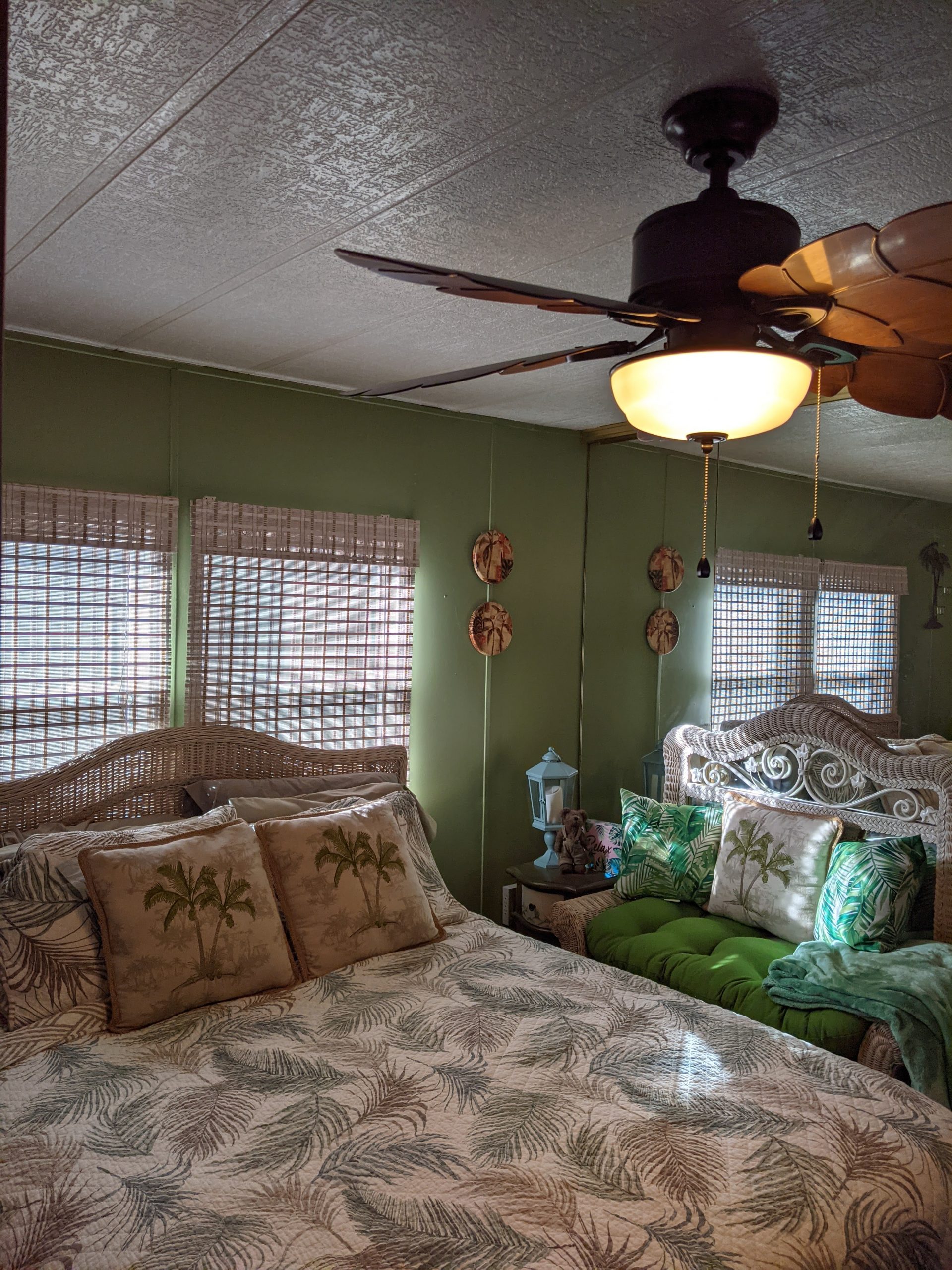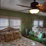 It’s a unique home, with a mirrored accent wall that reflects the sun and provides additional light to the home, and a palm leaf paddle fan – Check out the Pictures!